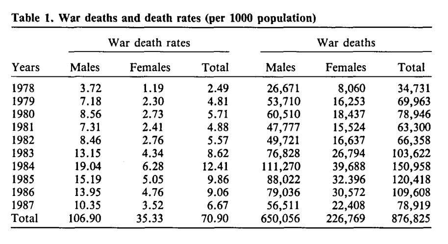 Documenting what is happening in a society suffering such violence as dramatic as that in Afghanistan in the 1980s is far from easy. The story of how the demographic data were compiled is itself mind-blowing. Unable to conduct a census in Afghanistan itself, Gallup Pakistan was commissioned by a consortium of international backers to carry out a survey of Afghan families in 318 refugee camps. They reported the losses in their families and their villages. Those data were checked and then the percentage rate of casualties are applied to growth and death rates projected forwards from the census of 1979.