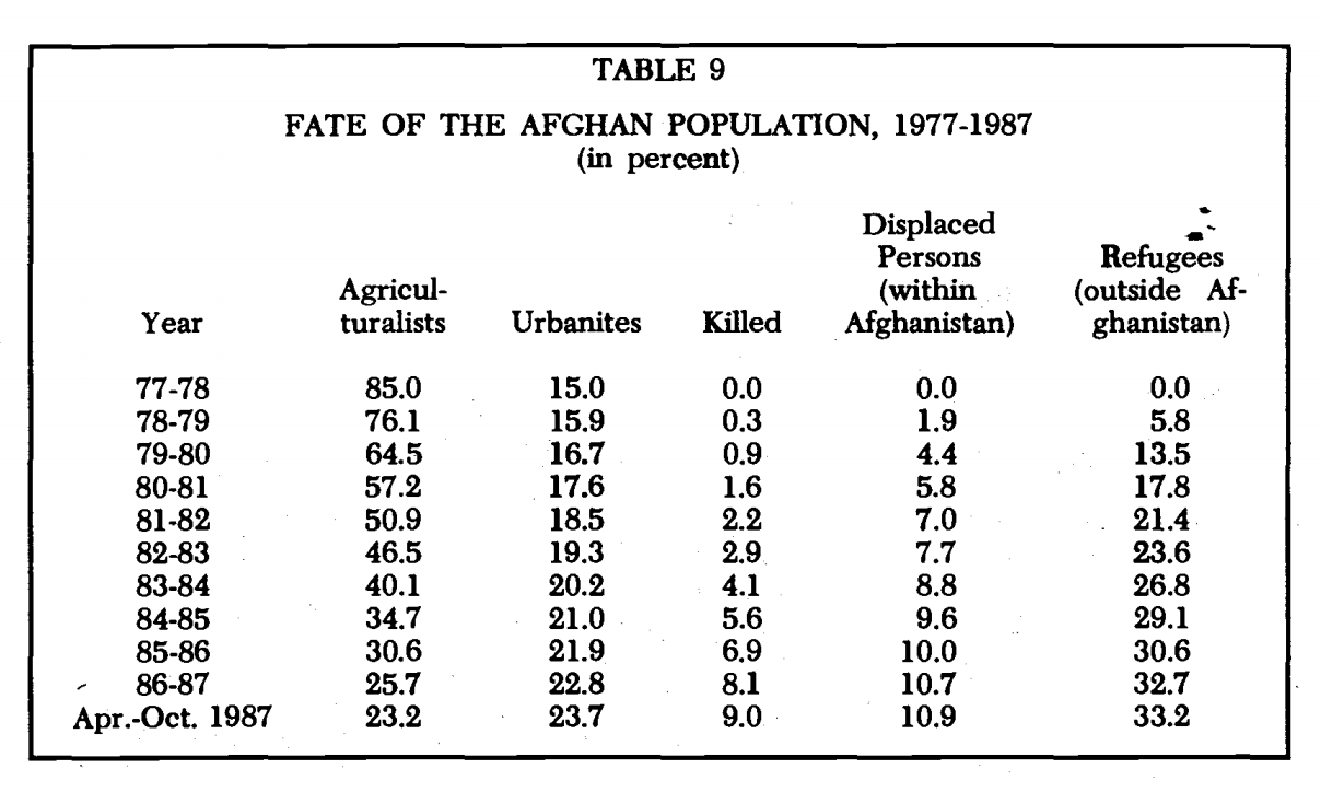 The share of Afghans engaged as agriculturalist in their home villages fell from 85 percent in prewar Afghanistan to 23.2 percent by 1987. The urban population surged. Nine percent died as a result of the war. All told, at 43 percent, refugees, inside and outside Afghanistan, were the largest group of the population. Less than half the population were in settled rural or urban circumstances. Cambodia under Pol Pot, or Poland under Nazi occupation come to mind as societies which have experienced analogous levels of disruption.