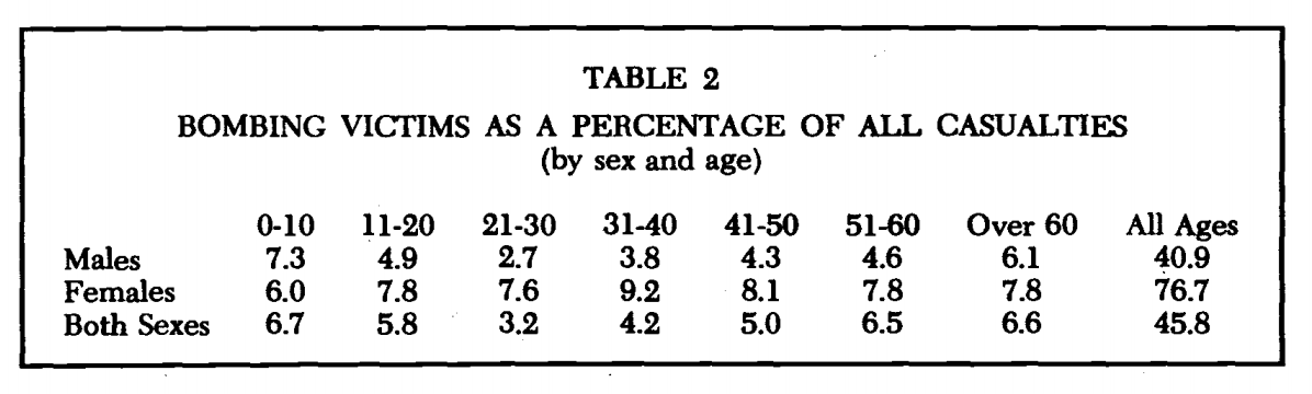 Though there is disagreement about the total figures, there is no doubt about the relative balance of casualties. In the provinces closest to the border with the Soviet Union overall casualties may have amounted to a staggering 16 percent of prewar population.. The most heavy toll was taken of men of middle age. Sliwnski estimated that of all men between the age of 31 and 50, 22 percent did not survive the war. Those are rates of mortality typical of combat units, applied to an entire population cohort. It suggests that all Afghan men were effectively treated as combatants.