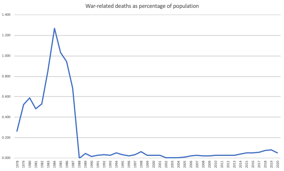 Even using Khalidi’s low estimates, the story is stark. The rate of war-related mortality surges in the 1980s and then falls sharply at the end of the war. Never again has Afghanistan experienced the intensity of destruction experienced in the 1980s.