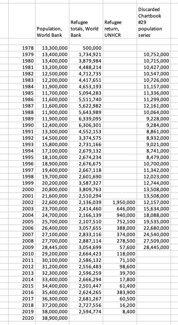 In Chartbook #29 I used a set of figures for population whose origins are frankly a little obscure. They show a very low population in the 1990s and a surging increase after 2001. I chose them because I assumed that they excluded the refugee population. I was looking for a measure not of the Afghan population as a whole, but of the population remaining in Afghanistan. Since what I was after was the percentage of casualties amongst those exposed to the fighting, it seemed like the best series to use. The discrepancy to World Bank population figures was large. The gap I assumed was due to the refugee population. The US authorities counted over 6 million returnees after 2001. That was enough to explain the difference.