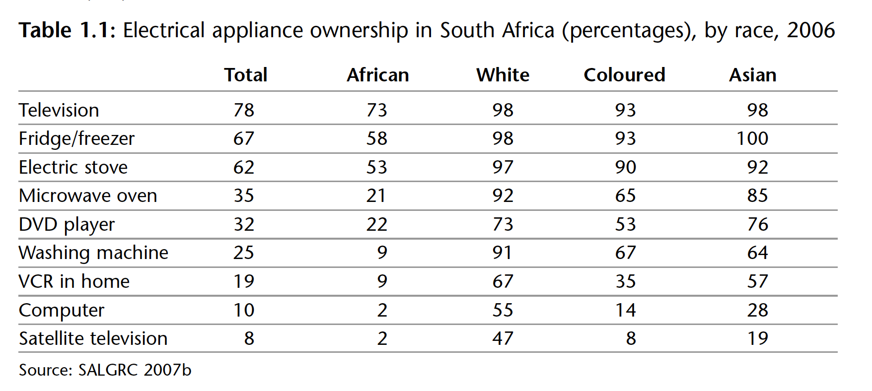 The most obvious question is who actually gobbled up most of South Africa’s power. Even allowing for mass electrification, low-income households accounted for no more than 5 percent of demand (McDonald Electric Capitalism, 16). Consumption per household remained extremely modest, in most cases barely rising above the 50kwh that were provided free per month from 2003. Penetration of consumer goods was defined by the extreme inequality of South African society and sharply demarcated along racial lines.