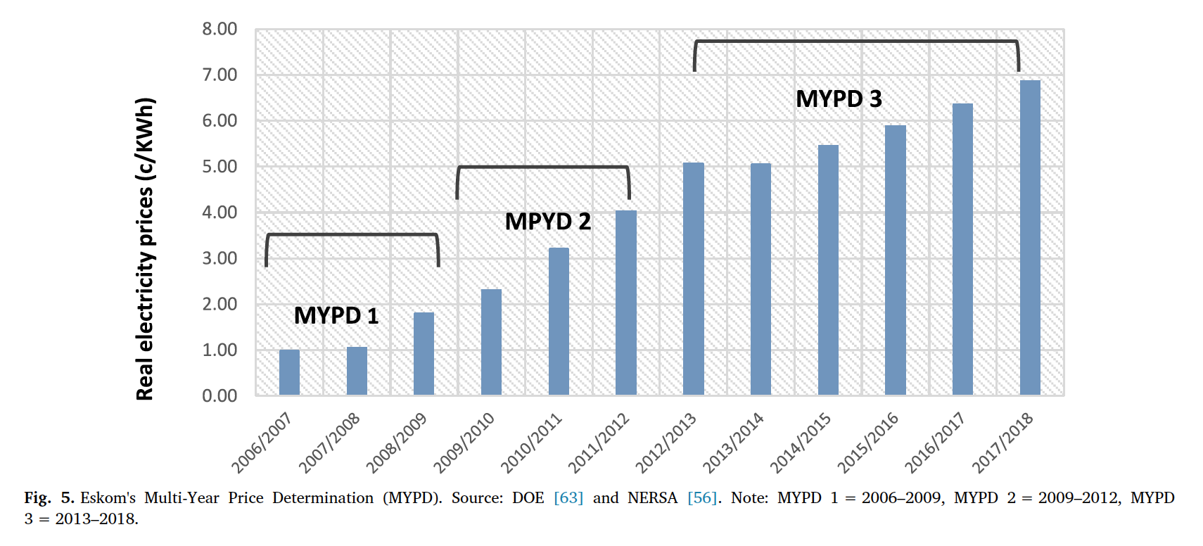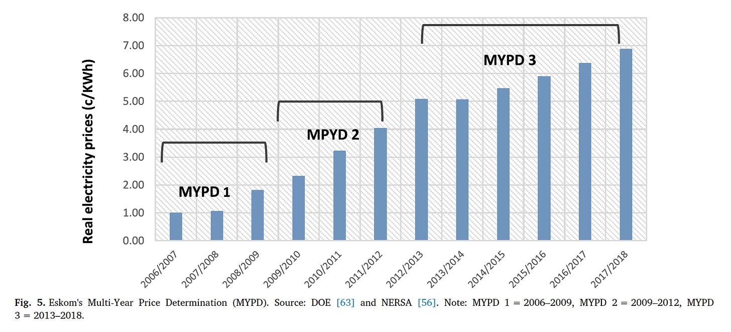 As in the 1970s capacity expansion brought with it the question of financing and that raised the issue of electricity pricing. In the early 2000s though it was neither unbundled nor privatized, ESKOM was corporatized meaning that it was converted into a free-standing, publicly owned corporation which paid dividends to the South African state. The quid pro quo in 2006 was a change to ESKOM’s pricing formula, which was notionally designed to align prices more closely with generating costs. With the approval of regulator NERSA, ESKOM would confront its vastly expanded customer base with a series of price escalators, structured as Multi-Year Price Determination (MYPD).