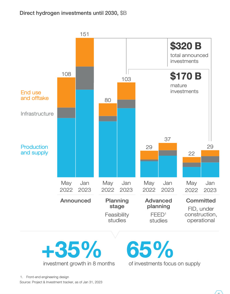 Whereas expanding solar and wind capacity and rolling out EVs and charging infrastructure are relatively uncontroversial and dominate the number to date. The same cannot be said for hydrogen. Hydrogen may burn relatively cleanly and yield electricity through fuel cells, but since hydrogen has to be produced through the application of energy, the process is inherently inefficient. Why not simply apply the electricity you are using to make hydrogen to the task at hand?