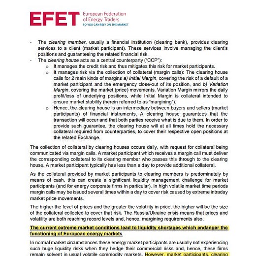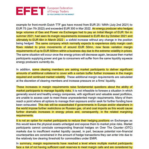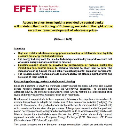 The EFET includes players like BP, Shell and commodity traders Vitol and Trafigura. What they asked for was “time-limited emergency liquidity support to ensure that wholesale gas and power markets continued to function. … Since the end of February 2022, an already challenging situation has worsened and more [European] energy participants are in [a] position where their ability to source additional liquidity is severely reduced or, in some cases, exhausted”. As a result it was “not infeasible to foresee . . . generally sound and healthy energy companies . . . unable to access cash”, the letter warned. People familiar with the matter said EFET members had raised the issue with central banks.