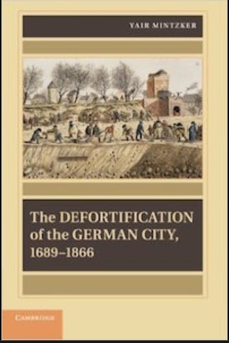 For a modern army, centered on fast-moving mobile operations, with ground troops that are not simply tank-centric, but mechanized and motorized in a comprehensive sense, the urban space is challenging. The city may have been remodeled for the motor car. It is no longer ringed by city walls as was true across Europe until the late 18th century. In the early 19th century those walls were commonly razed to enable more traffic. Check out this fascinating history by Yair Mintzker on the defortification of Germany in the 18th and 19th centuries.