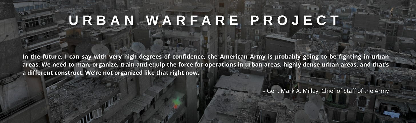 If you want to see the state of the art twenty years on, check out West Point’s Modern War Institute, Urban Warfare Project It comes with a ringing endorsement from General Milley, which could be taken directly from the critical urban studies literature of the 1990s or 2000s.