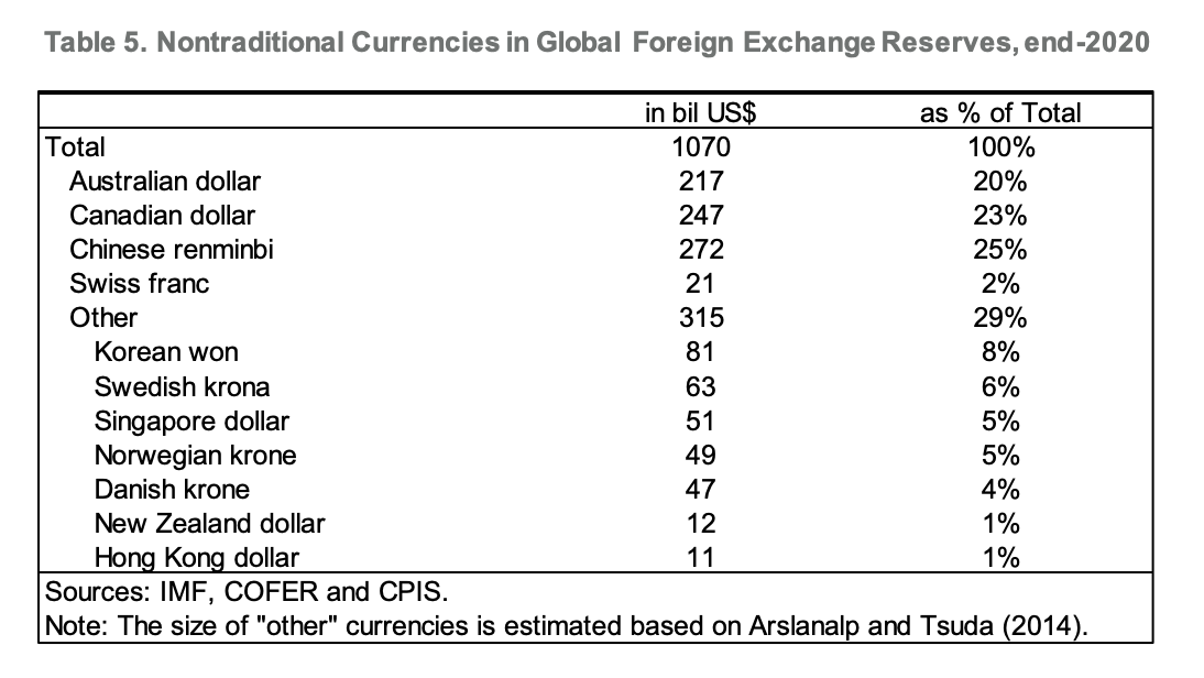 Since 2000 the share of the dollar in global reserves has fallen from 70 to 59 percent in 2021. The chief beneficiaries are Canada, Australia, Sweden, South Korea and Singapore.
