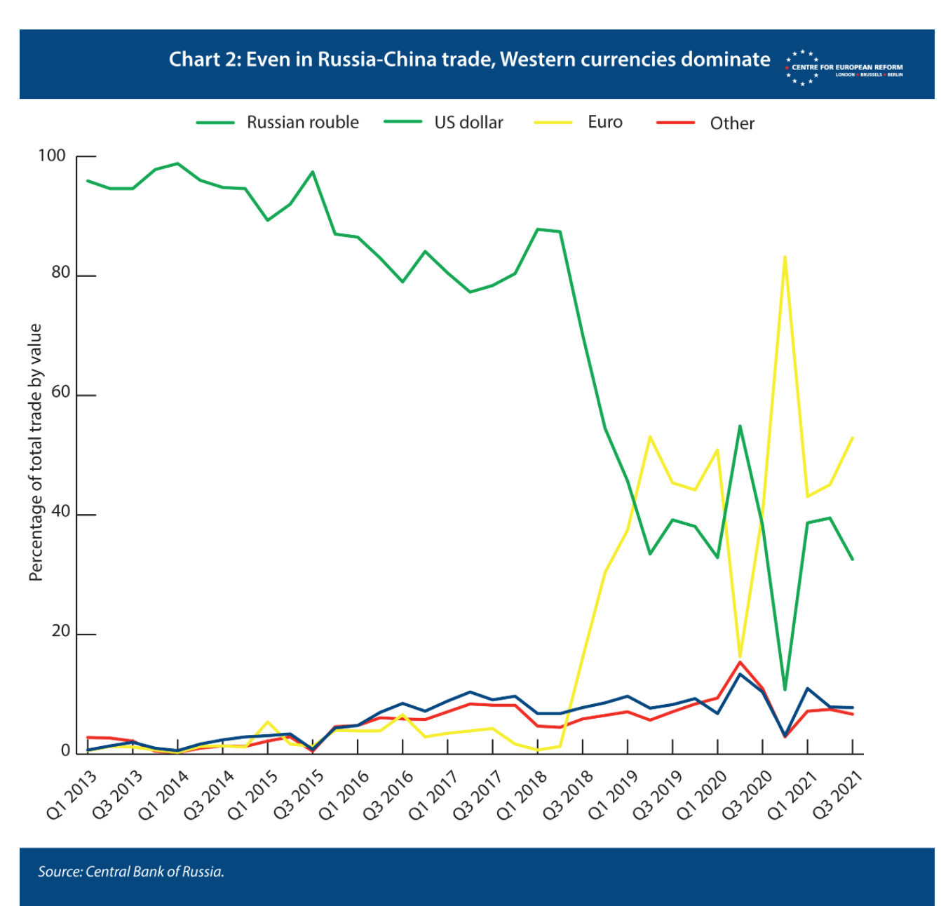 The numbers documenting the total global dominance of the dollar-euro system are familiar. But I found this restatement of the case by Zach Meyers of CER particularly compelling. This graph of the use of dollars and euro in trade between Russia and China since 2014 is particularly striking. Almost all of the trade between the two putative rivals to Western power, currently goes through Western currencies.