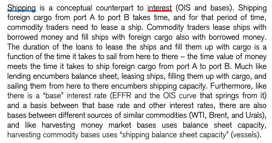 The counterpart to the trade-off between money now and money later that defines the rate of interest in Pozsar’s scheme, is the fact that moving commodities from one place to another takes time. So, in our supply-chain-obsessed world, shipping is the counterpart to interest. One of the pleasures of reading Pozsar is to follow him as he loses himself in detail, whether it be bond markets, the plumbing flow of shadow banking, or oil tankers.