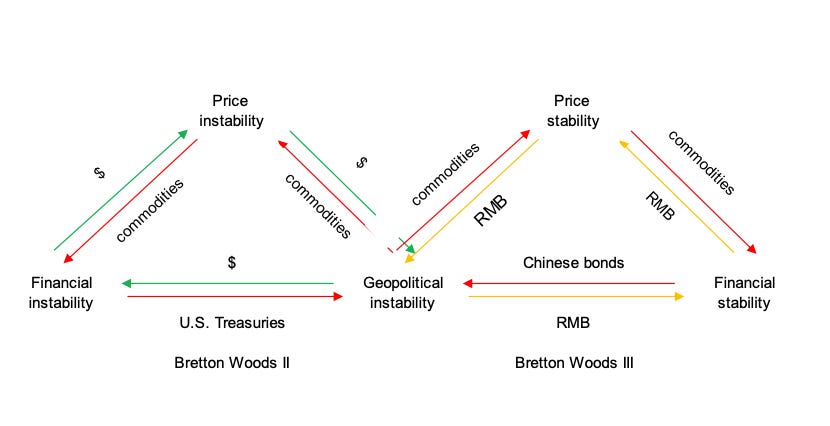 Bretton Woods II served up a deflationary impulse (globalization, open trade, just-in-time supply chains, and only one supply chain [Foxconn], not many), and Bretton Woods III will serve up an inflationary impulse (de-globalization, autarky, just-in-case hoarding of commodities and duplication of supply chains, and more military spending to be able to protect whatever seaborne trade is left).