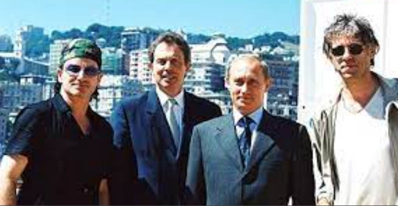 Putin with Bono, Blair and Bob Geldof, from the Russian Presidential website.