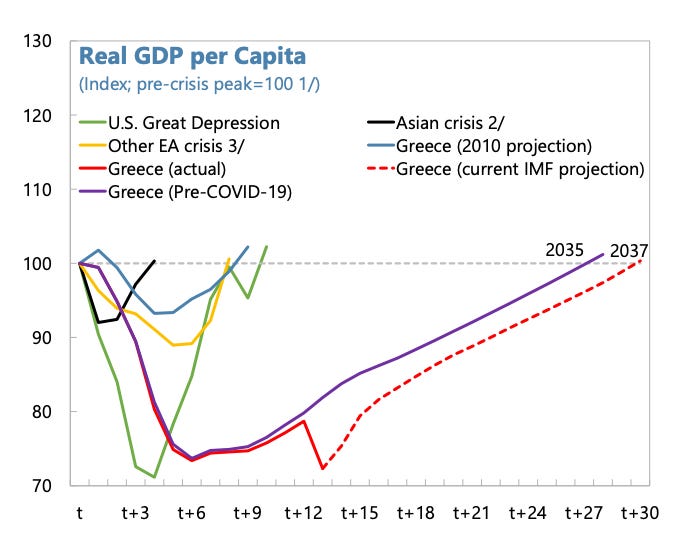 To put it mildly, this was not the advice that Athens received between 2010-2018. After 2009, on the basis of faulty economic predictions and bad economics, Greece was driven into one of the most devastating economic crises on record. As bad, but far more sustained than America’s Great Depression of the 1930s.