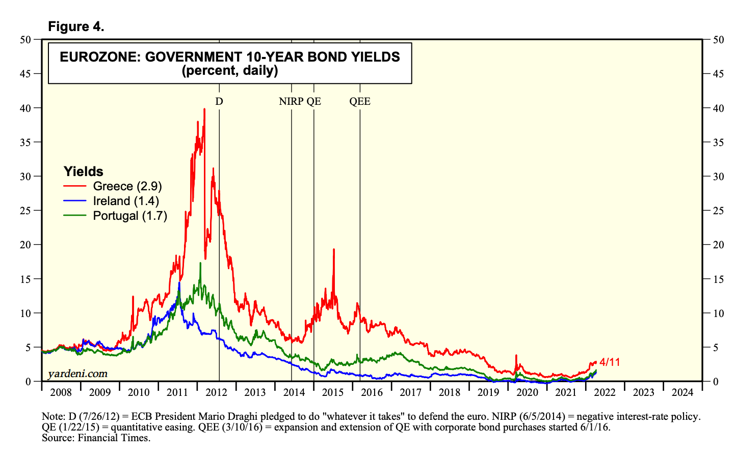 Two months on, the level of Greek yields is still elevated. This graph by Yardeni Research puts things in perspective. The current yield on the thinly traded market for 10-year Greek bonds is 2.9 %. That is not 40% as in 2011 - just ahead of restructuring. But it is by some margin the highest in the eurozone. 50 basis points ahead of Italy.