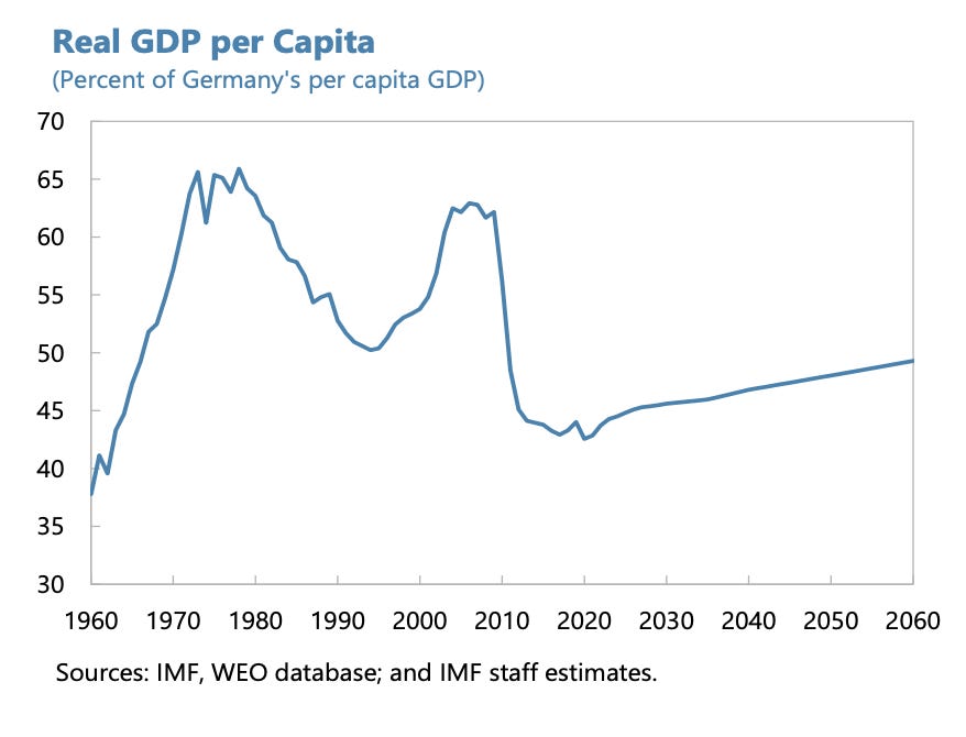 The one thing that does seem clear, however, is that Greece’s story of convergence with Western Europe is over. The single most staggering graph in the IMF’s Article IV assessment from the summer of 2021 is this one: