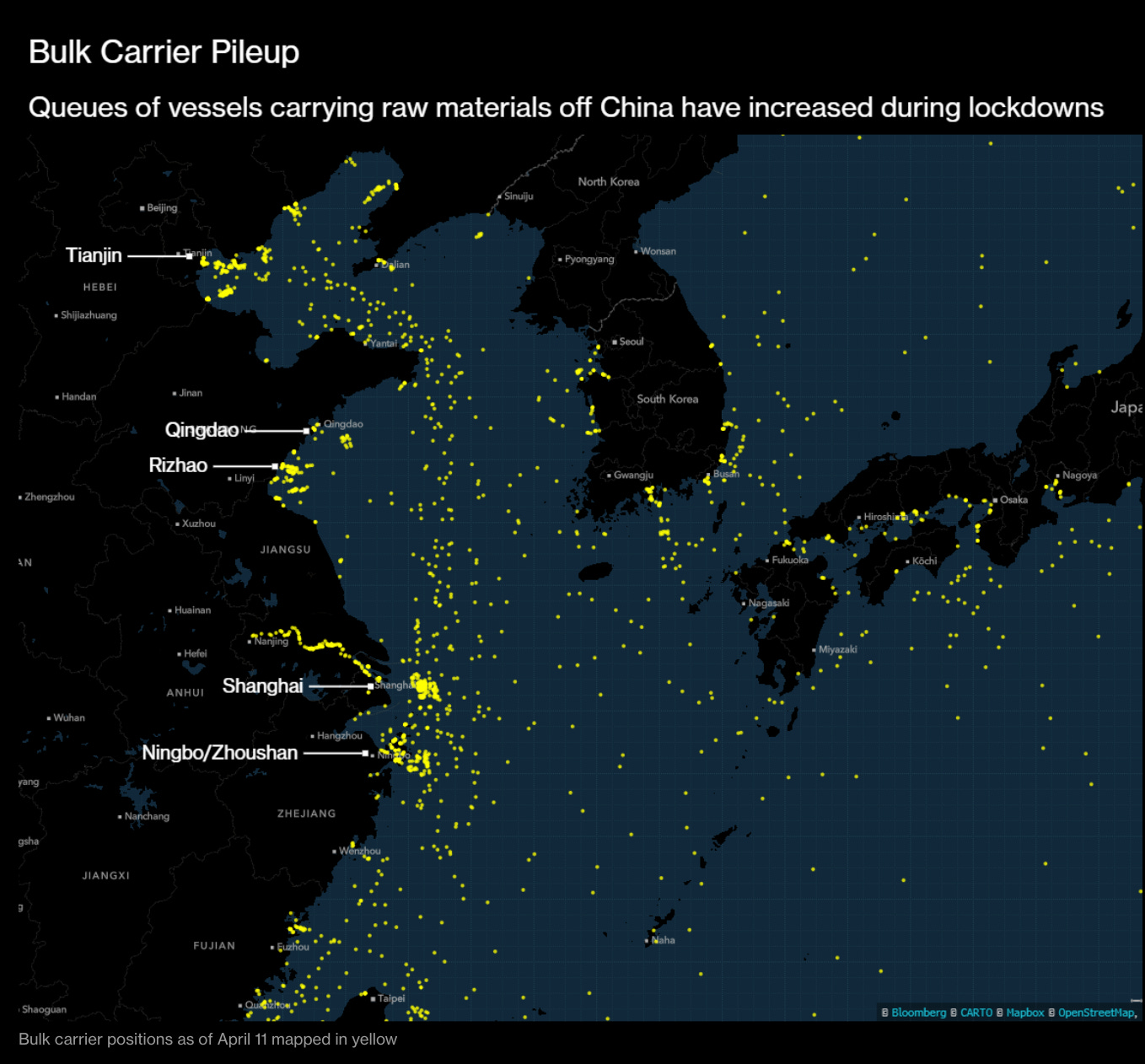 What about the lockdowns and supply-chain problems? They could certainly get bad! All eyes on Shanghai. This image from Bloomberg dramatically captures the pile up of bulk carriers off the Chinese coastline.