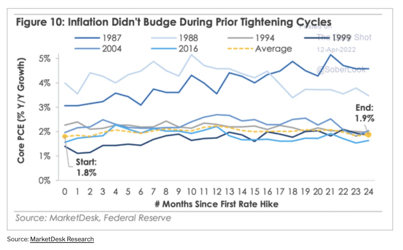With the naked eye it is pretty hard to detect any appreciable influence of Fed rate tightening on inflation in the US since the 1980s. Of course we all know about the Volcker shock. But that was extreme. In all the other tightening cycles since 1987 the effect has been virtually invisible.