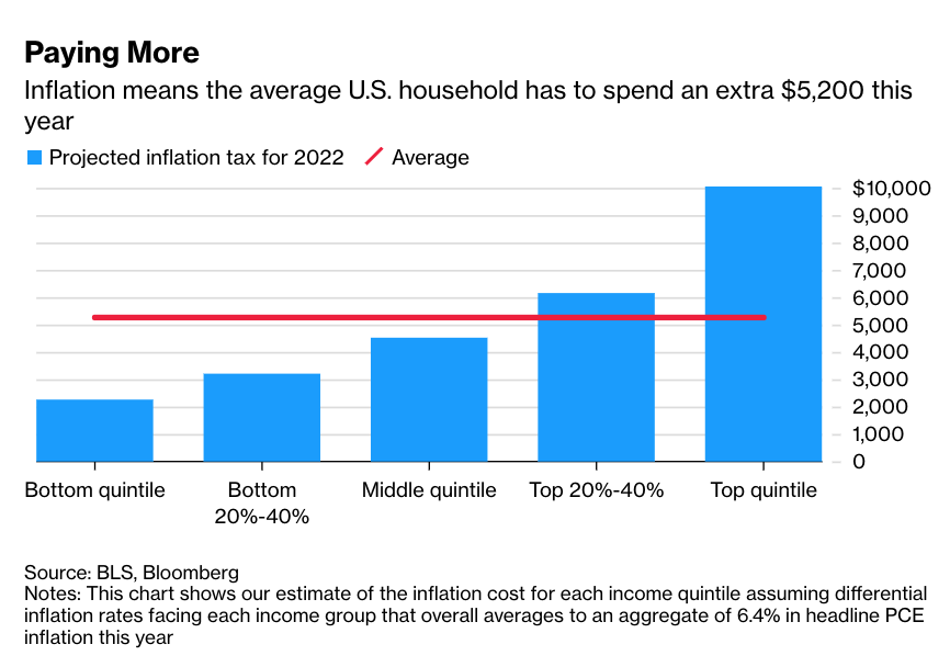 Inflation will mean the average U.S. household has to spend an extra $5,200 this year ($433 per month) compared to last year for the same consumption basket, according estimates by Bloomberg Economics. The excess savings built up over the pandemic, and increases in wages, will cushion those costs, and allow spending to expand at a decent pace this year. But accelerated depletion of savings will increase the urgency for those staying on the sidelines to join the labor force, and the resulting increase in labor supply will likely dampen wage growth.