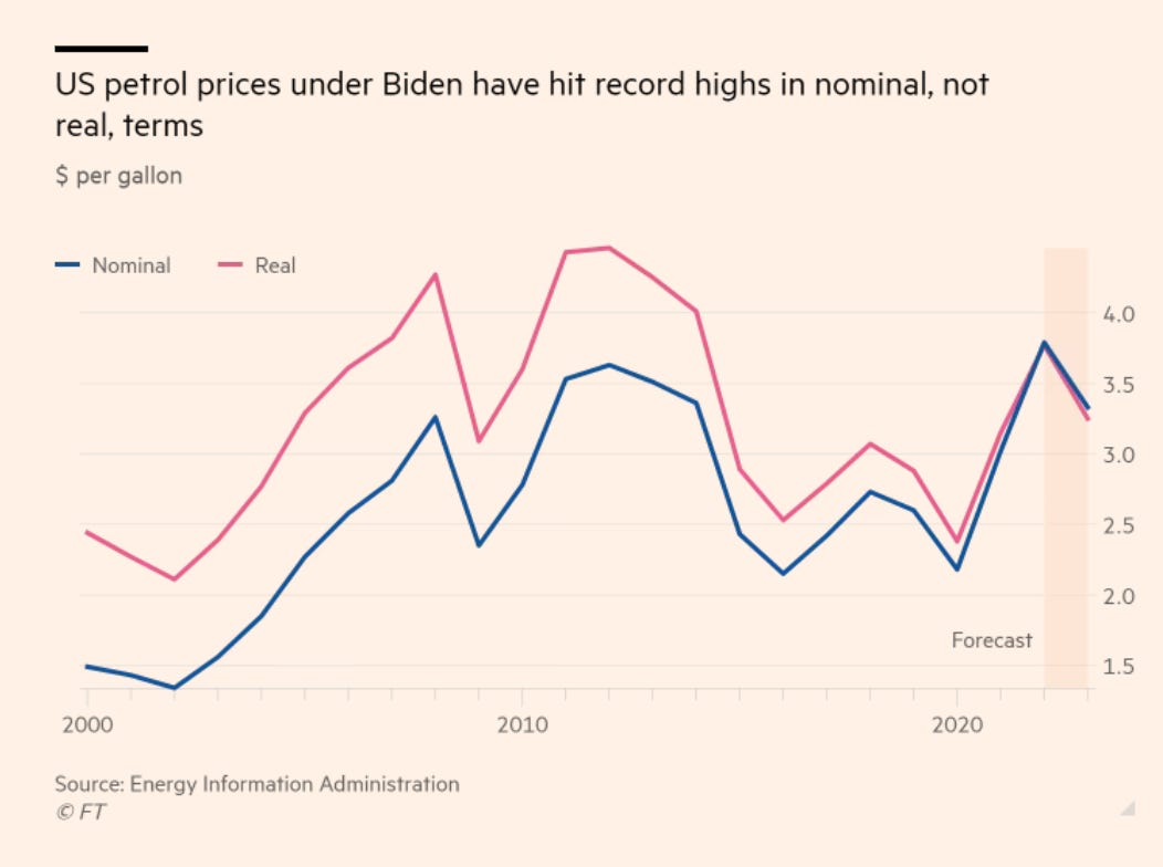 It is also important to remember that inflation rates are not the same as price levels. If you are the Biden administration facing the midterms in November, the surge in petrol prices is a nightmare. But once adjusted for general inflation, the current rate of petrol prices in the US, is still some way short of historic highs.