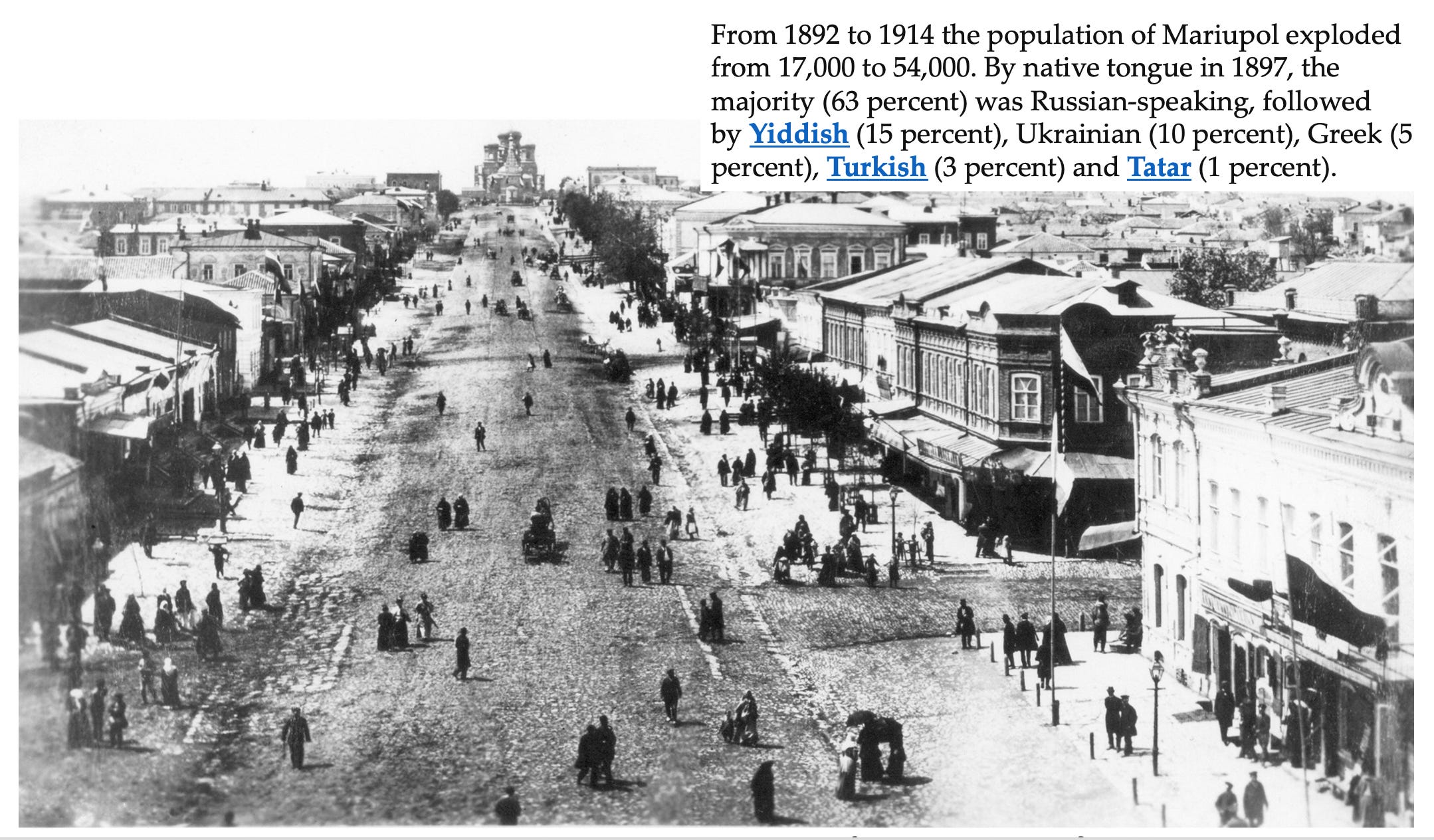 In early 2014, Mariupol was a typical mid-sized post-Soviet industrial city, dominated by two major steelworks, both under the control of the country’s richest oligarch, Rinat Akhmetov, and the port used to export their output. …. Backed by Akhmetov’s political clout and resources, the Party of Regions of then-president Viktor Yanukovych held sway. The population, including tens of thousands of Azov Greeks — descendants of the city’s 18th-century Orthodox Christian founders, resettled by Russia from still-independent, Muslim-run Crimea — was predominantly Russian-speaking and had little to do with Ukrainian ethnicity or culture.
