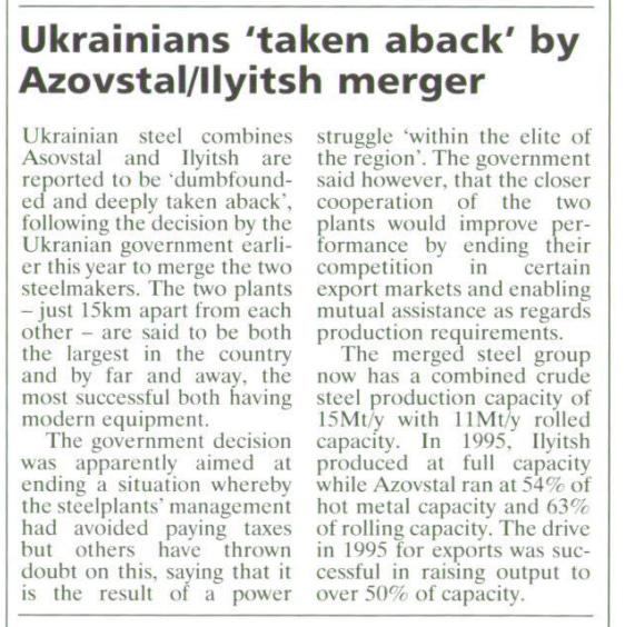 And then, the oligarchic power struggles of the Donbas broke loose. In November 1996 Mariupol’s two steelworks, long-time competitors, were suddenly merged into a single conglomerate. As the Steel Times reported, the local population were dumbfounded.