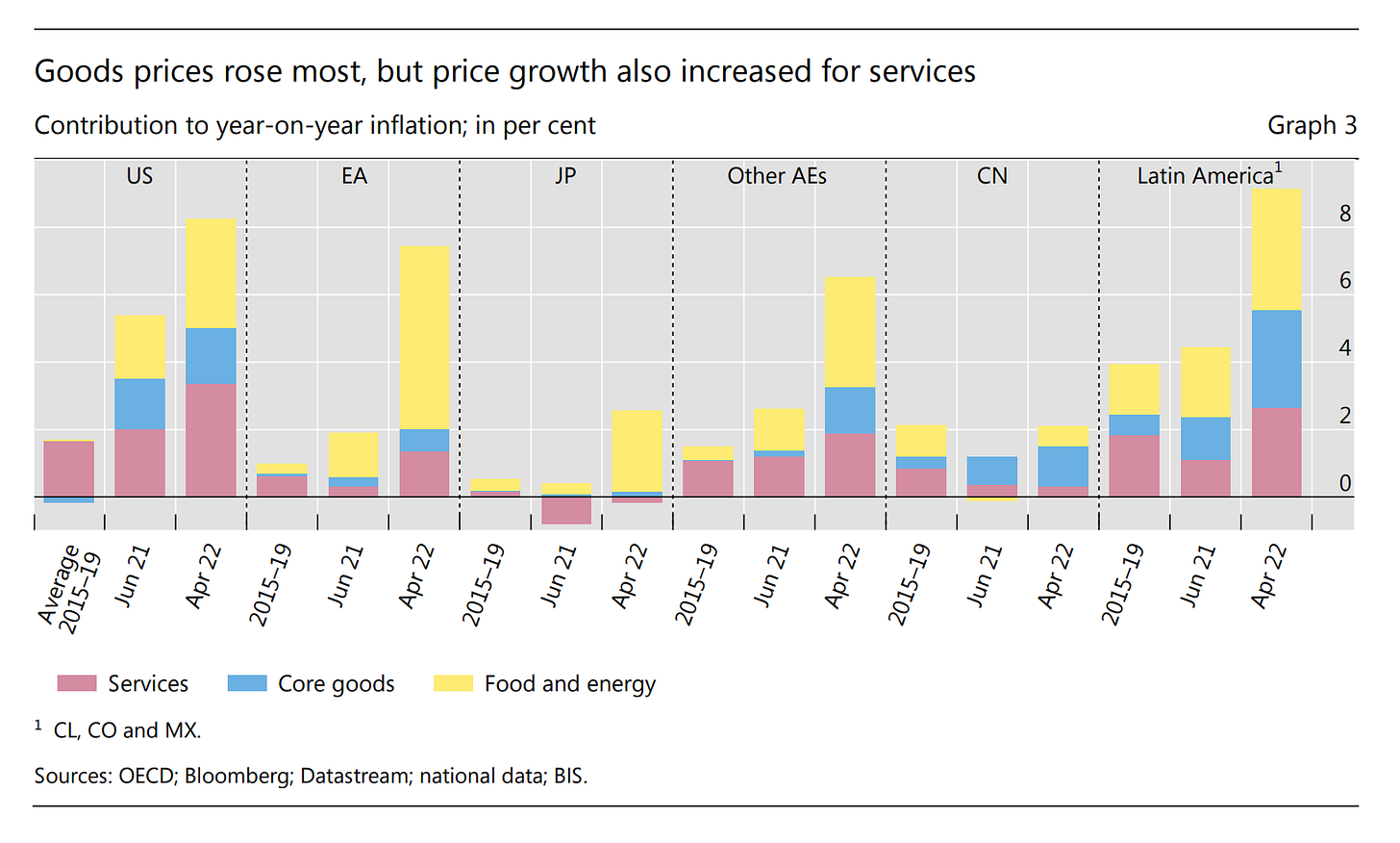 Inflation in Europe has been far more rapid. But as of April 2022 more than two-thirds of inflation came from food and energy. This makes for an interesting contrast with the Americas - both in the United States and Latin America - where inflation is fast and involves all areas of the economy, including services (which are by far the largest part).