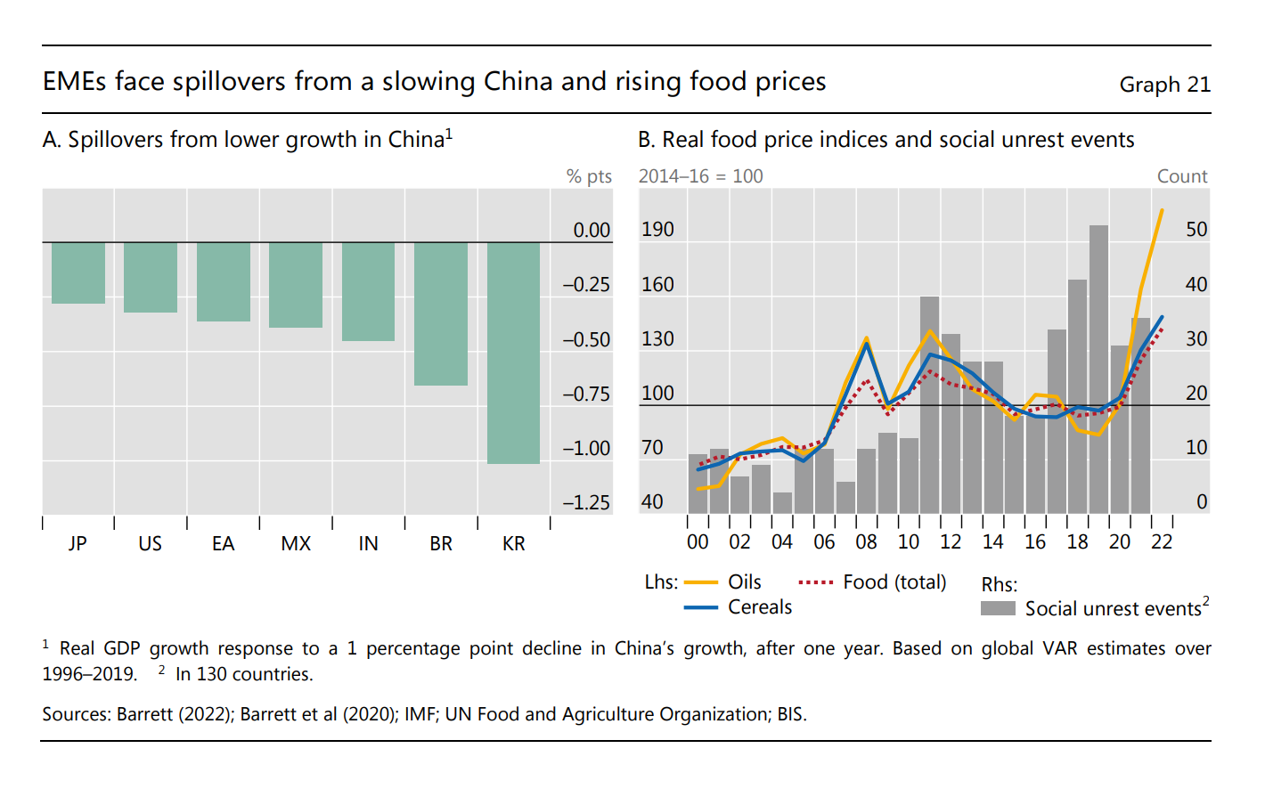 Many EMEs (emerging market economies) are highly exposed to stagflationary risks. Growth prospects had already deteriorated pre-pandemic, with potential growth rates on average 2 percentage points lower than before the GFC (2008). In addition, in many EMEs pandemic scarring is more evident than in AEs. By the first quarter of 2022, the median length of full school closures due to Covid-19 had amounted to 29 weeks in Latin America and 16 weeks in emerging Asia, compared with six weeks in AEs.19 Labour force participation is also recovering more slowly. In Latin America, in particular, participation rates in 2021 were some 2 percentage points below pre-pandemic levels.20 Many EMEs are highly exposed to slower Chinese growth, especially countries in emerging Asia and some commodity exporters (Graph 21.A). And, in countries where vaccination rates lag, health and economic activity could be more vulnerable to further pandemic waves. Even if growth does not decline, higher inflation tends to be more disruptive in EMEs. Since inflation expectations are less well anchored in some of these countries, not least in Latin America, larger nominal policy rate increases are required to control inflation. Surging food prices are also more disruptive. Sharp rises in food prices have been associated with social instability and the imposition of export controls in the past, with recent price levels surpassing those seen during the food price spike of 2011 (Graph 21.B).21 And while regulated food and energy prices, and the associated subsidies, will lower the immediate pass-through to headline inflation in some EMEs, they come with a fiscal cost and can create economic distortions.22 Combined with growing demands for social spending in the pandemic’s aftermath, larger fiscal deficits could eventually feed through into exchange rate depreciations and inflation (Chapter II).