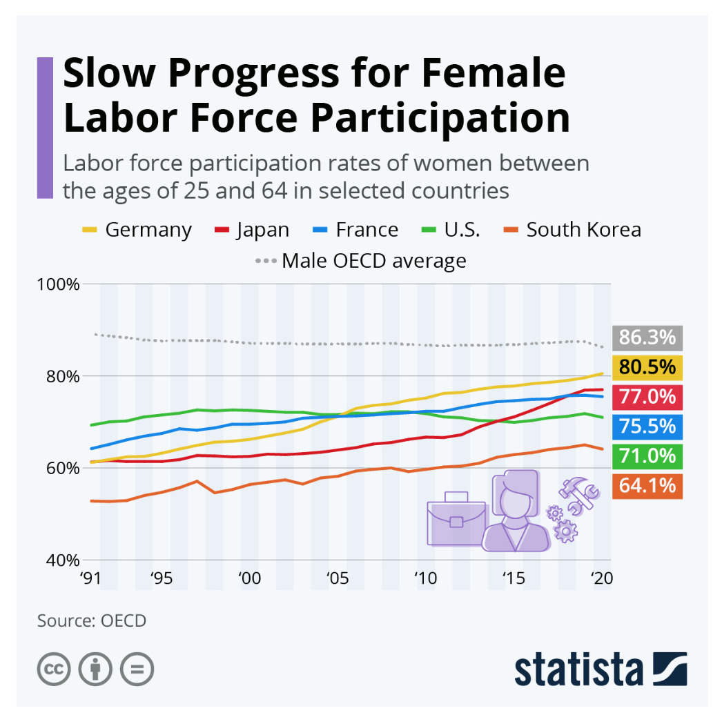 To address Japan’s declining labour force, Abe favored women’s labour market participation. And during his administration Japanese women did enter the labour market as never before. The fact that a significantly larger percentage of Japanese women are in paid employment than in the United States is a remarkable historical turnaround.