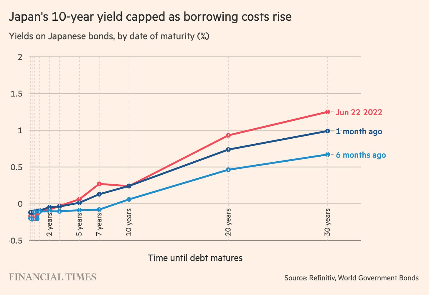 Aside from the 10-year yield, which is pinned by the BoJ’s policy, shorter and longer-term borrowing costs have been pulled upwards as global interest rates rise. Japan’s yield curve — the graph of its yields across increasing maturities — would usually be a smooth upward-sloping line. But it has developed a distinct kink around the 10-year point.
