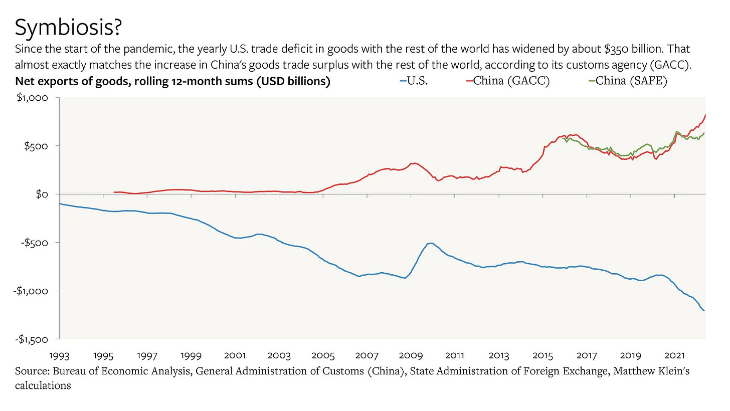 Matt Klein, Michael Pettis’s co-author in their excellent Trade Wars are Class Wars, expands on their diagnosis in his excellent Overshoot newsletter. As Matt Klein points out, China and the US’s mirror-image responses to the COVID crisis have resulted in mirror-image current account movements. The US stimulated consumption, whereas China relied on infrastructure spending. America’s surging deficit matches China’s mounting surplus.