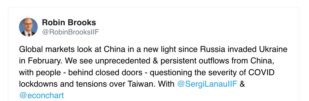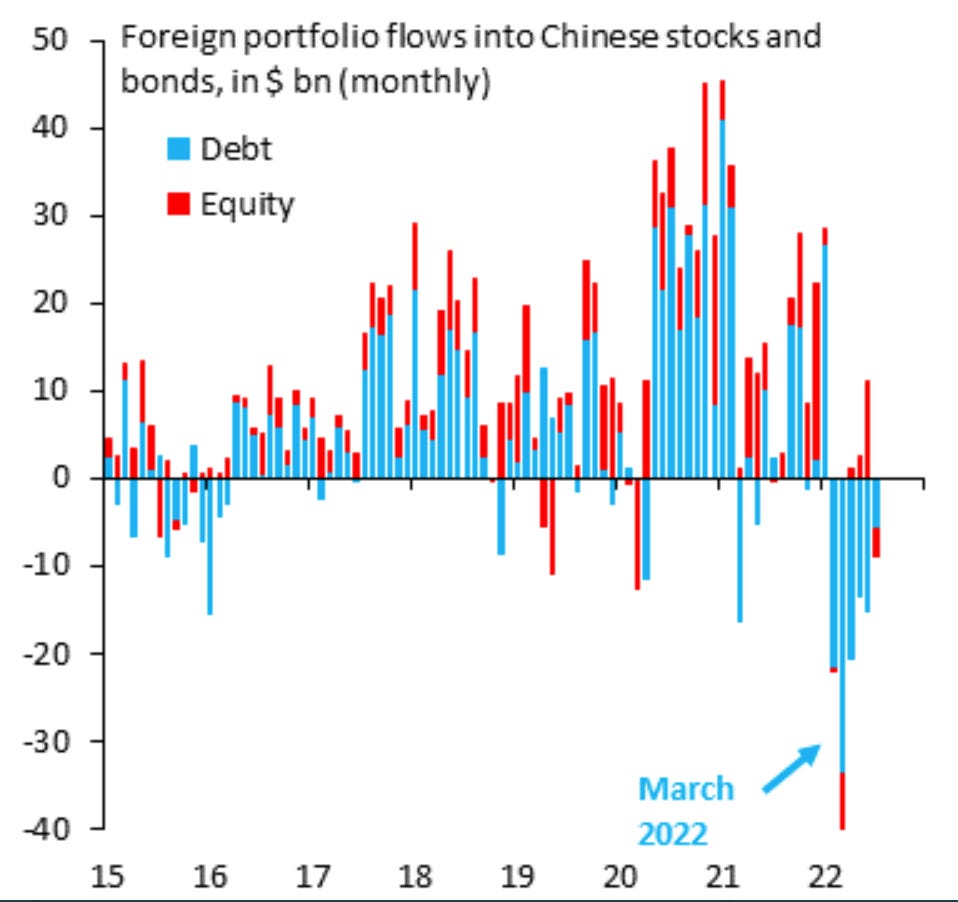 Since the start of 2022 Robin Brooks and his team at the IIF, which, as the trade body of global finance has a privileged insight into capital flows, have been tracking a dramatic reversal in foreign portfolio flows into China. There are some valuation effects in these numbers, as Chinese equity markets have sold off, this reduces the value of foreign claims. But, even allowing for these effects, on net, foreign investors have been off-loading Chinese debt and equities at record rates.