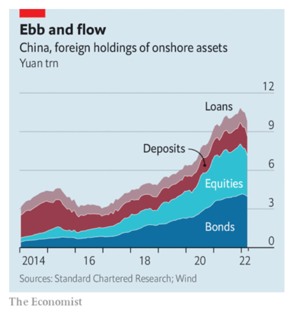 The policies were a clear sign that Beijing meant business. And the West reciprocated. In 2018 msci added Chinese shares to its flagship emerging-markets index. Other index inclusions followed, creating a flood of foreign capital into onshore Chinese securities. Between the start of 2017 and a peak at the end of 2021, foreign financial exposure to yuan-denominated assets more than tripled to 10.8trn yuan.