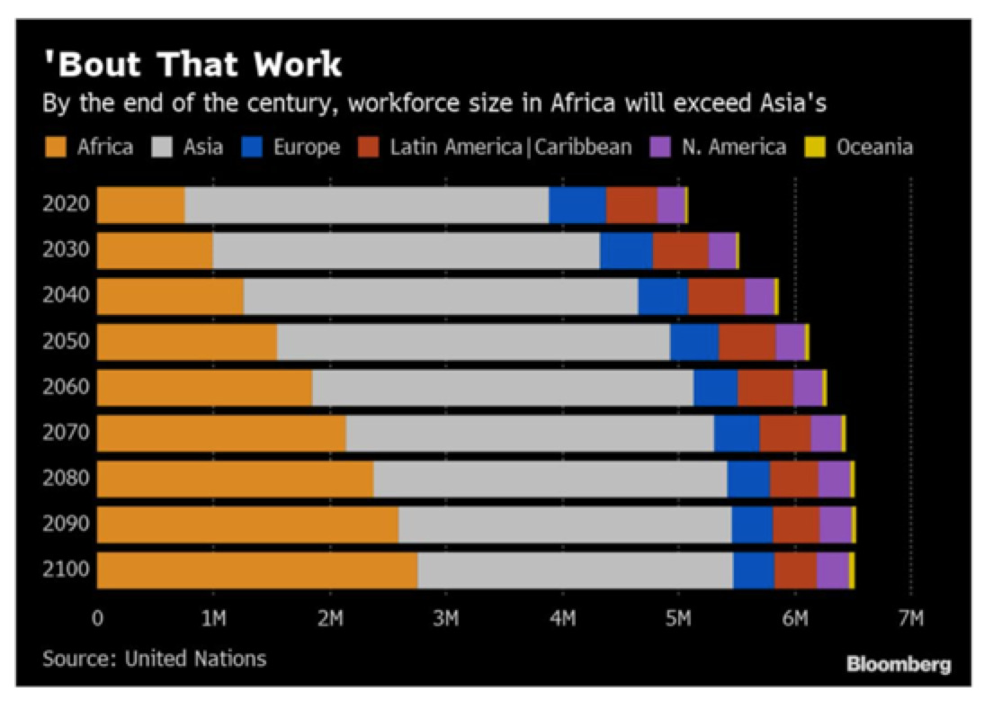 A key factor in the decades ahead will be the demographic development of the world’s workforce. By 2050 the population of Africa of working age will outnumber the working-age population of the world ex-Asia.