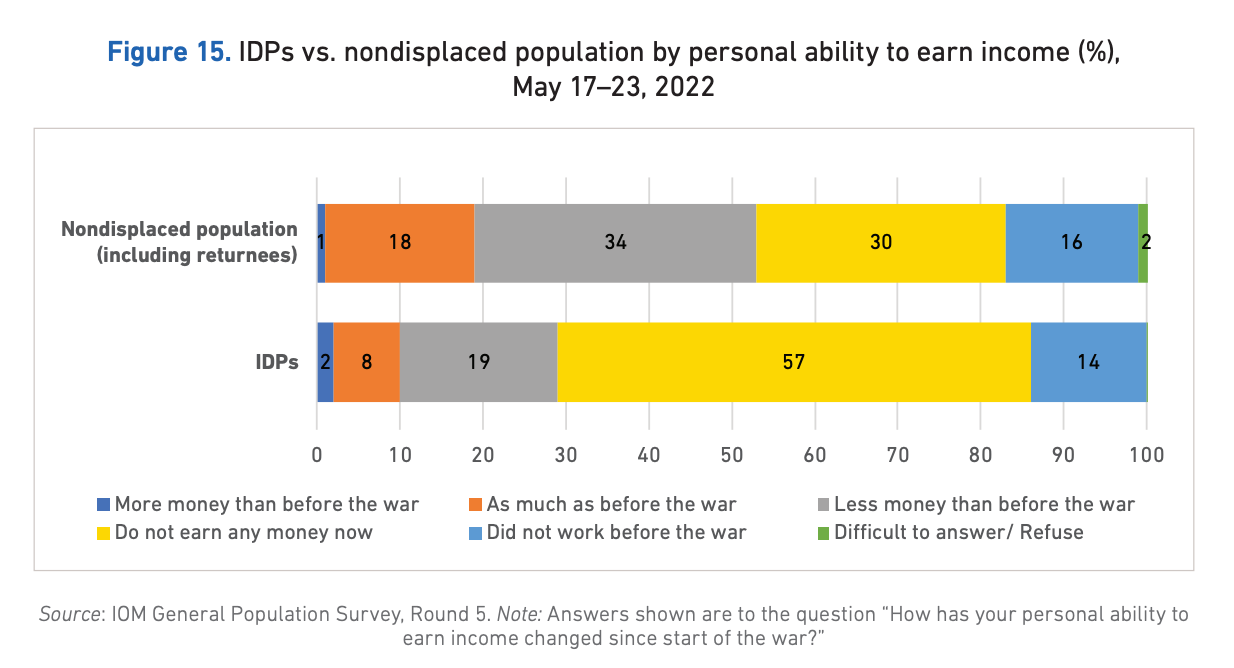 One-third of Ukrainians have been displaced by the war. Over 6.8 million Ukrainian residents have left the country, a large majority of them women and children.4 An estimated 6.6 million people are internally displaced—fewer than in the previous month5 —with many individuals displaced more than once since leaving their homes of origin.6 According to the UN Office for the Coordination of Humanitarian Affairs (OCHA), the humanitarian situation is deteriorating rapidly, as access to critical services such as clean water, food, sanitation, and electricity declines, and 17.7 million people are left in need of humanitarian assistance