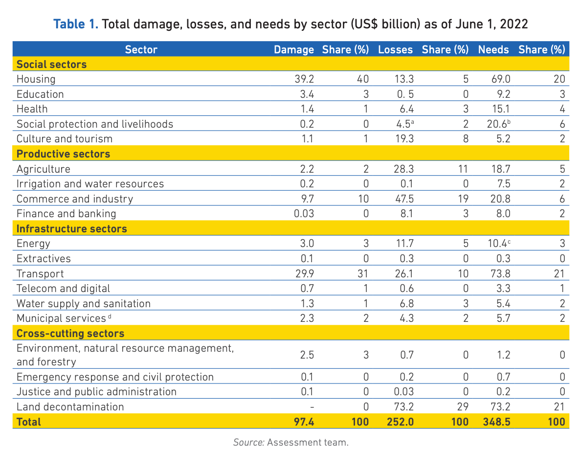 The main purpose of the Rapid Damage and Needs Assessment report is to document the financial needs of long-term reconstruction. To this end the report contains an impressive compilation of tables showing damage to housing, infrastructure and the need for decontamination.