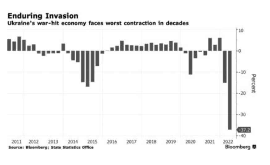 Under the immediate impact of Russia’s assault, in the first quarter of 2022 Ukraine’s GDP shrank by 15.1 percent year over year (YoY), wtih a gigantic 45 percent fall in March. In the second quarter, the contraction on an annualized basis was measured at 37 percent. This is far worse than the shock suffered by Ukraine in 2014-2015. With some signs of recovery in August, Kyiv is now guestimating that the contraction for the year as a whole will be in the order of 33 percent.