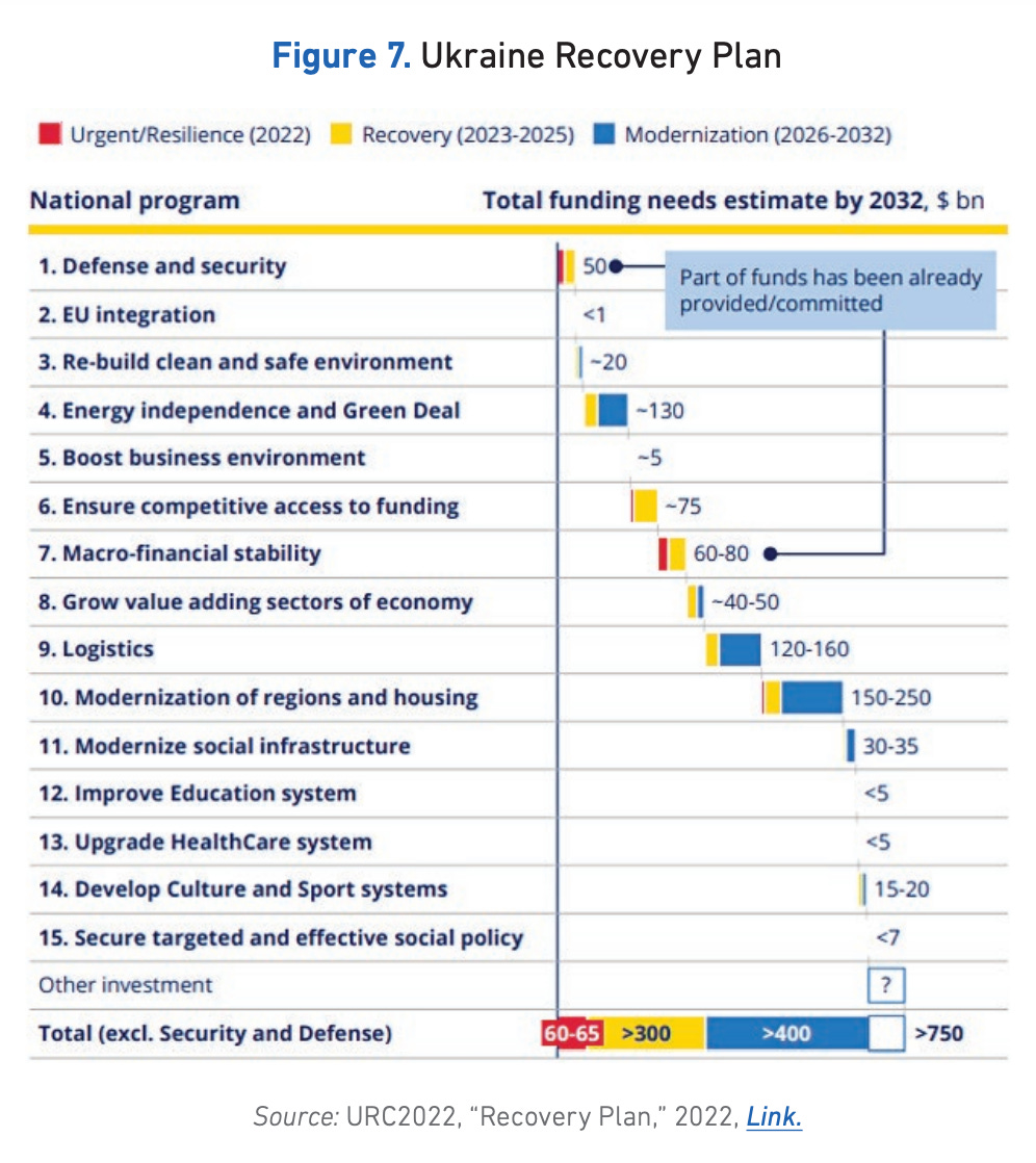 As laid out at the Lugano reconstruction conference in July, Kyiv has a recovery plan that stretches to 2032 and involves spending on reconstruction and modernization totaling $750 billion.
