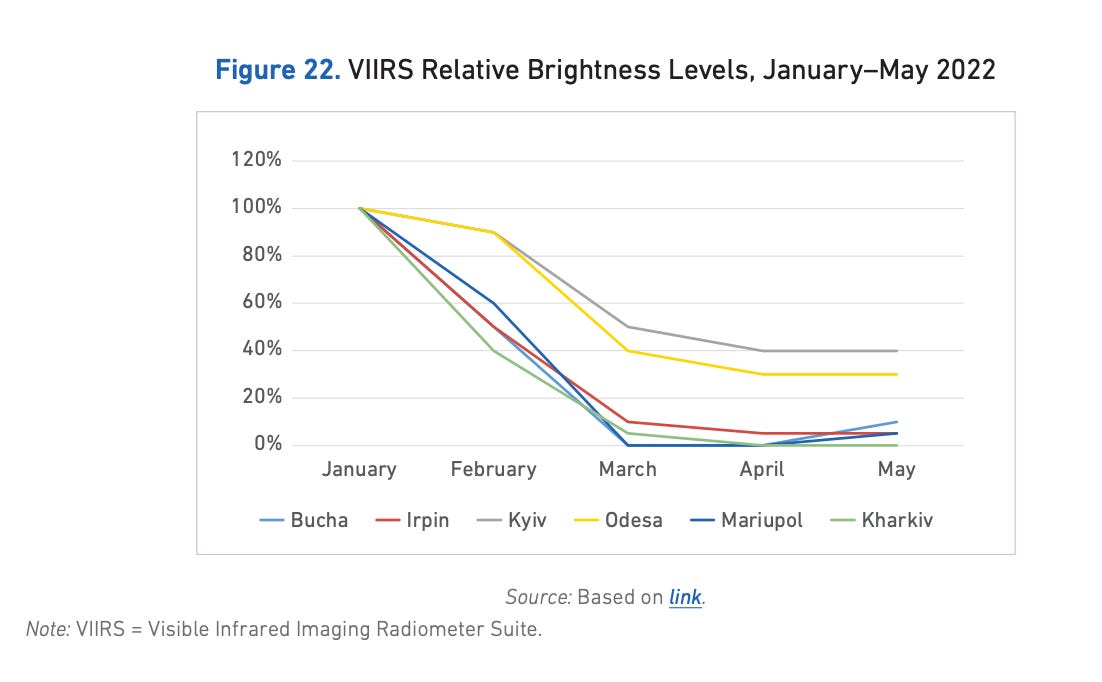 These GDP figures are dramatic. But they are also rather abstract. A more concrete way to track the level of economic activity is to monitor night-time illumination. All over Ukraine in the spring of 2022 the lights went out.