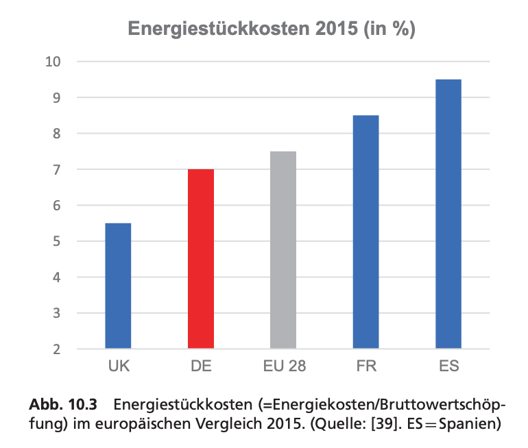 Taking energy costs as a whole in relation to gross value added across the entire economy, Germany before the crisis was certainly in a somewhat favorable position relative to its European neighbors, but by no means in a league of its own. And it enjoyed that position not because of lower energy costs but because of greater efficiency in the use of energy.