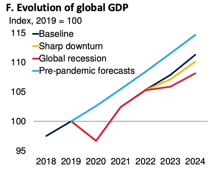 If you put the combined effect of monetary and fiscal policy together, you arrive at very grim scenario for the world economy. A modeling exercise by Justin Damien Guénette, M. Ayhan Kose, and Naotaka Sugawara of the World Bank, suggests that in the event of a recession, global GDP would not reach the level predicted on the pre-COVID trend for 2024 until somewhere around the end of the decade.