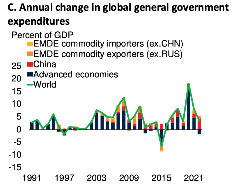 Nor, in 2022, is it only monetary policy that is set in contractionary mode. On the fiscal side, growth in government spending is being retrenched.
