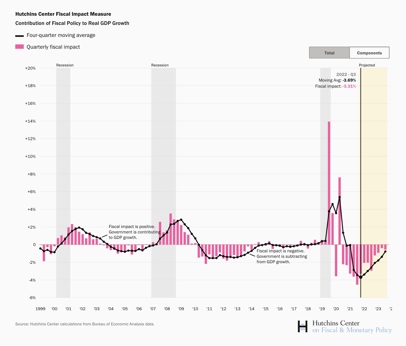 Fiscal policy reduced U.S. GDP growth by 4.6 percentage points at an annual rate in the second quarter of 2022, the Hutchins Center Fiscal Impact Measure (FIM) shows. The FIM translates changes in taxes and spending at federal, state, and local levels into changes in aggregate demand, illustrating the effect of fiscal policy on real GDP growth. GDP fell at an annual rate of 0.6% in the second quarter, according to the government’s latest estimate.