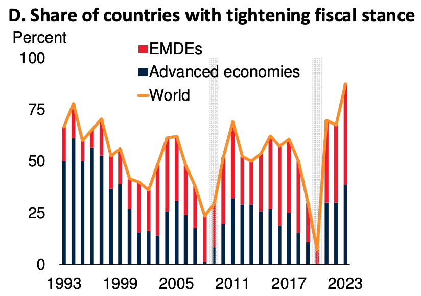 The tightening of monetary policy is compounded by a similar shift in fiscal policy. This attracts far less headline space than interest rates, but it too is unprecedented. The share of countries that are tightening their fiscal stance is greater today than it was during the global austerity drive after 2010, or in the heyday of the Washington consensus in the 1990s.