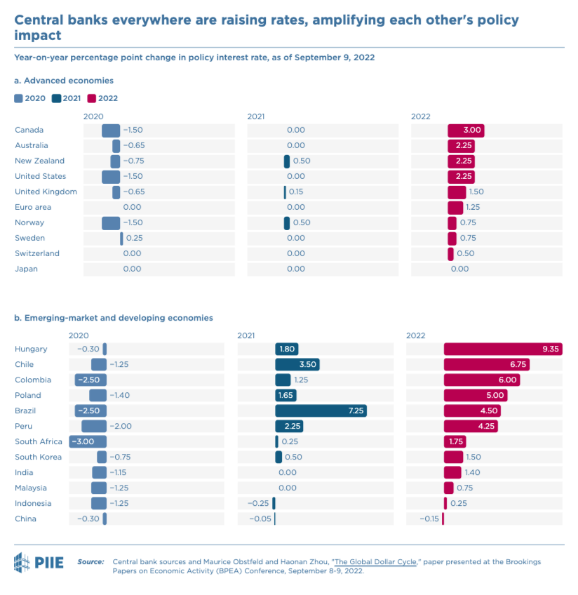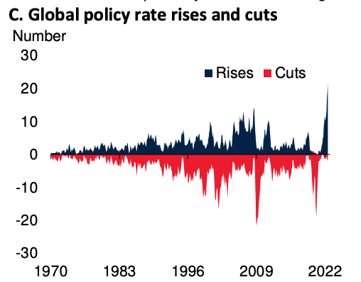 In response to the surge in prices that began in earnest in the summer of 2021 central banks all around the world are hiking interest rates. When taken together, a series of national policy moves add up to the most widespread tightening of monetary policy since the start of the fiat money era in the early 1970s.