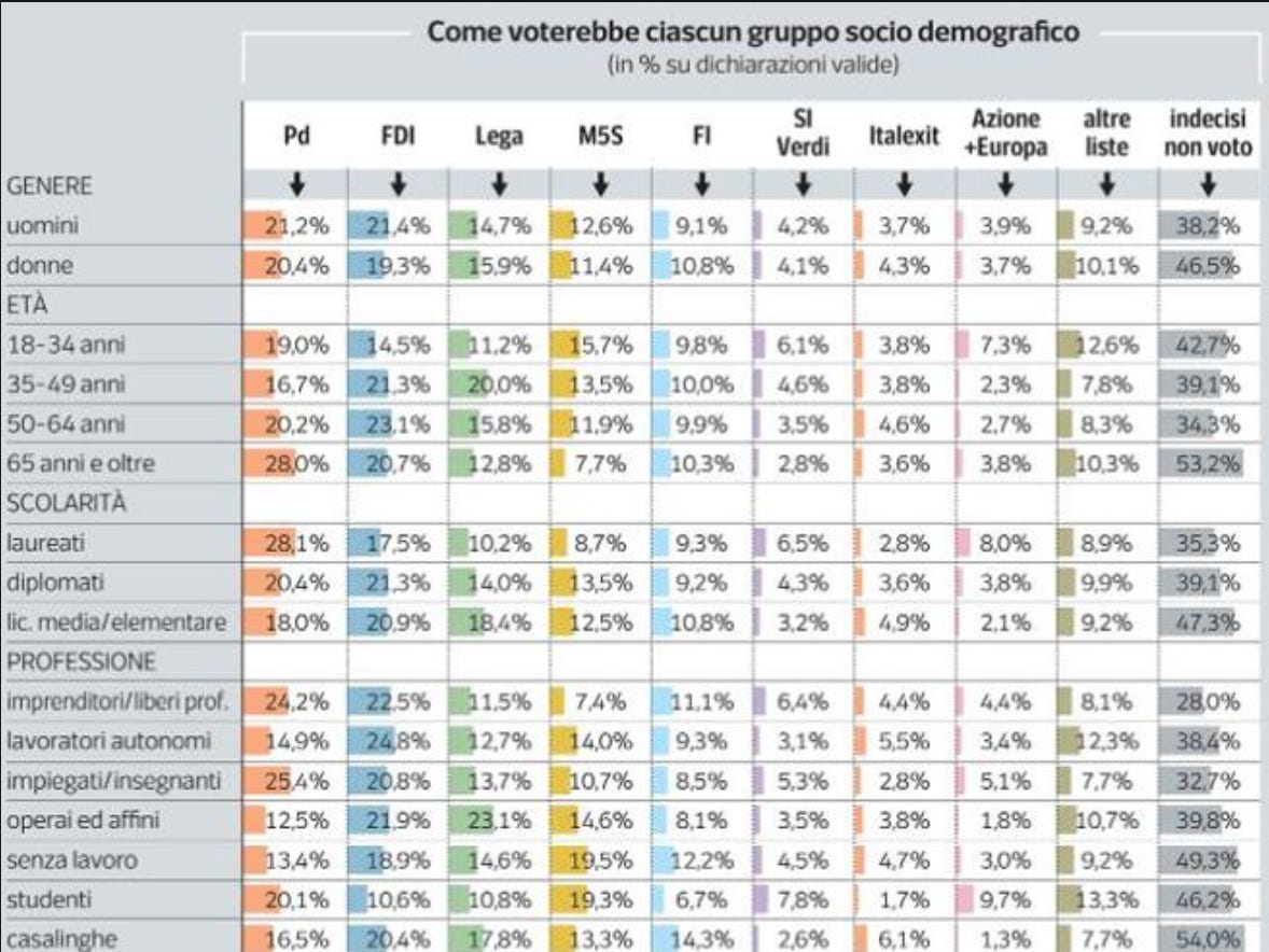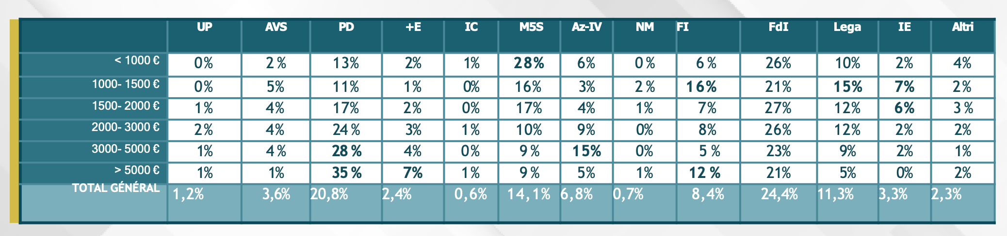 So, apart from not attracting the votes of students and pensioners, the occupational and income data do not really give us a clear view of the far-right Fratelli voters. Meloni who is herself from a working-class background and a tough suburb of Rome will do well with working-class voters, but that does not mean that she will do particularly badly with other social groups.