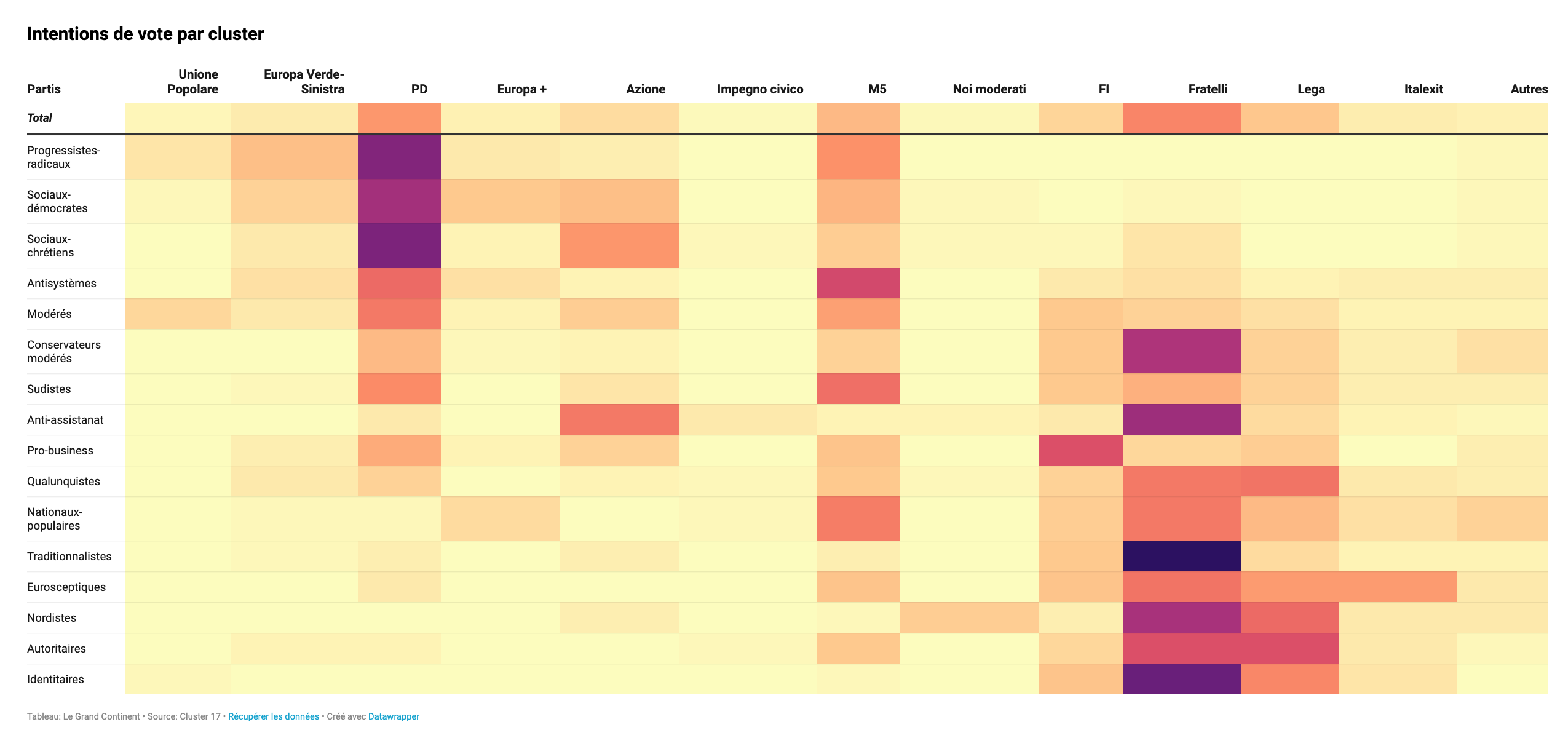 The strength of the Fratelli, by contrast, lies in their ability to mobilize support from 5 distinct conservative clusters ranging from moderate conservatives to identitarians and authoritarians (whose vote the Fratelli split with the Lega). Strikingly where the Fratelli score most strongly are not with modern radicals of the right, but with traditionalist. They also score heavily with anti-welfarists (anti-assistanat).
