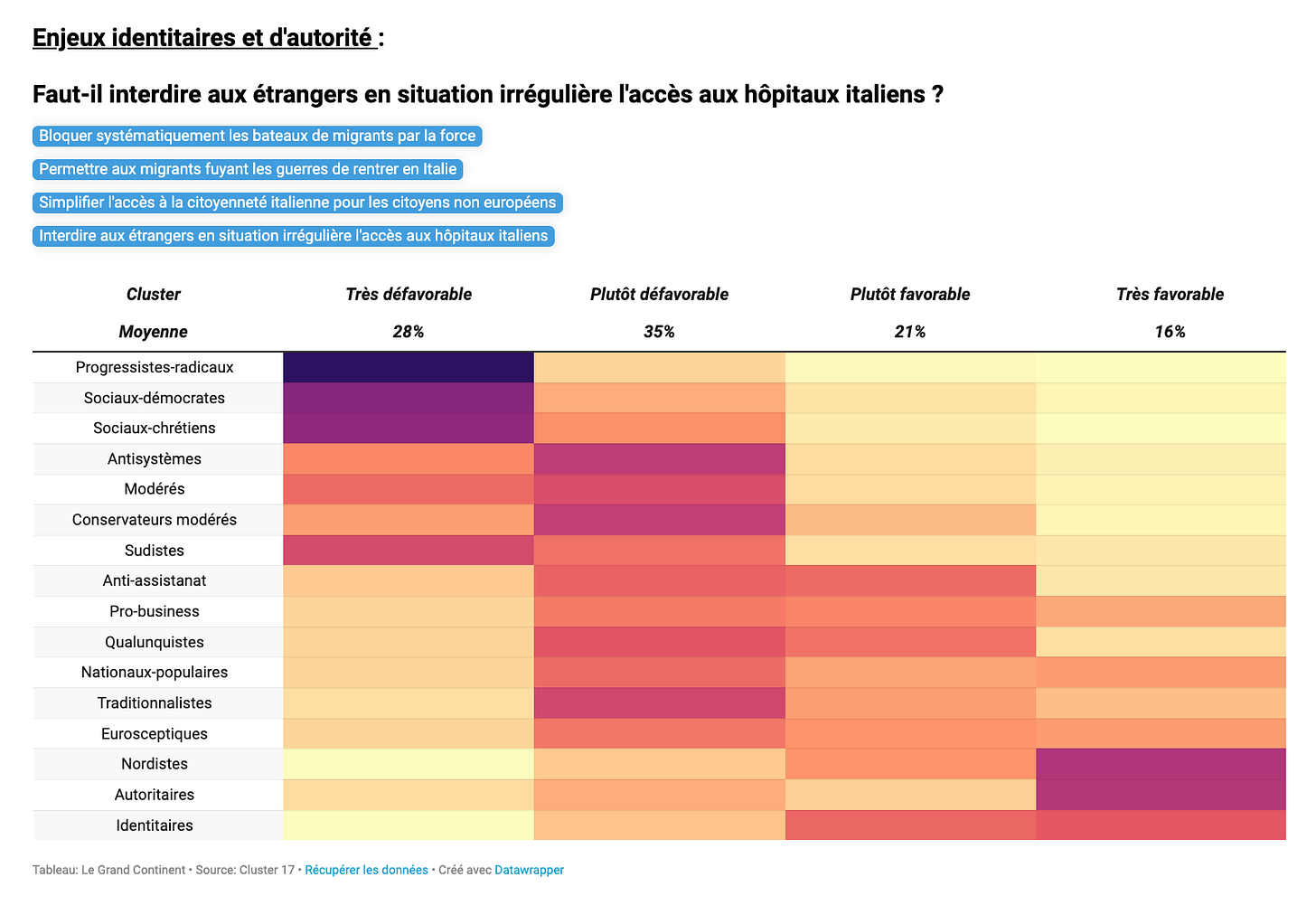 One can distinguish the different cluster of social and cultural attitudes by asking a series of questions, such as for instance: Should illegal immigrants be banned from access to Italian hospitals? This is a view that is popular with authoritarians and identitarians and opposed by progressive-radicals, but also by social catholics and social democrats.