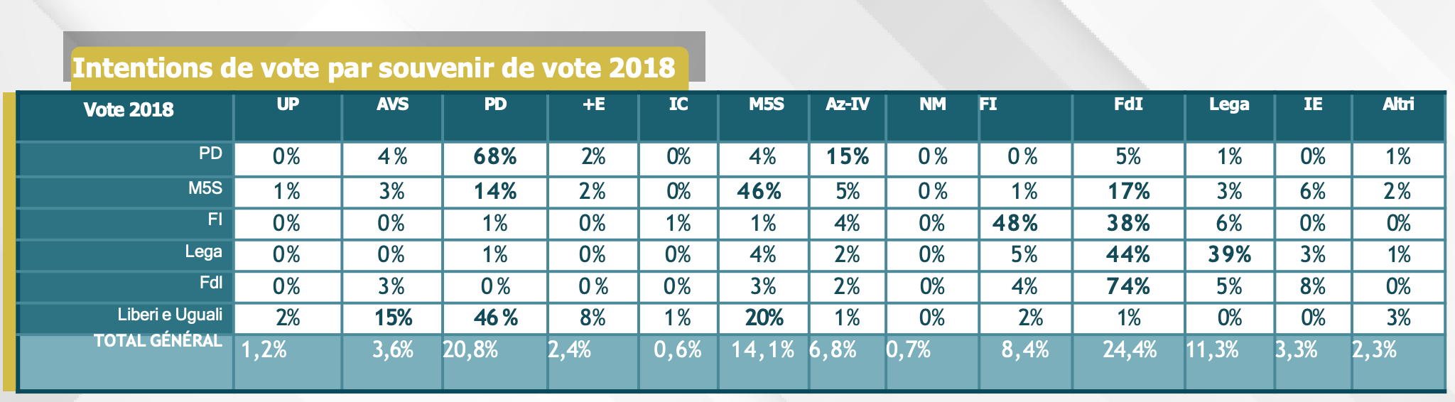 Compared to 2018 it seems that the Fratellli will gain their success largely by bleeding the electorates of the other conservative parties. According to the polls, they will likely take 44 percent of the vote cast for the Lega in 2018 and 38 percent of the Forza Italia vote. They will take a far smaller share from 5Star.
