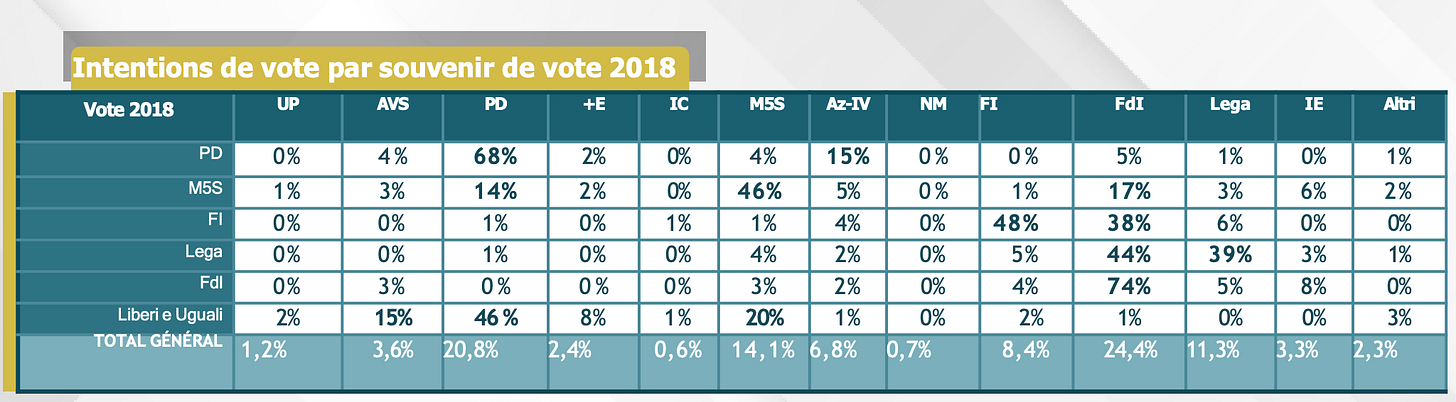 Recording the latest Ones and Tooze podcast on the upcoming Italian election, I realized that though there was plenty of analysis of the history of the Italian far-right and the figure of Giorgia Meloni, I had not seen any polling data in the English-language media showing us who was expected to vote for them, or any of the other contenders.
