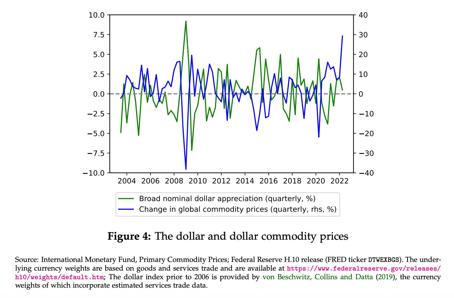 As Obstfeld and Zhou note, the dollar exchange rate moves inversely with global commodity prices (measured in real terms).